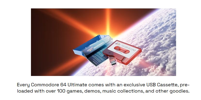 As I mentioned previously, the Commodore 64 Ultimate edition, which is an authentic-style FPGA-based C-64 computer with modern features, starts at just $299.99 USD. It’s leaving production for shipping soon (use this link to save $10 on any order). Among the production and materials updates was a cool announcement about an “exclusive USB Cassette, pre-loaded with over 100 games, demos, music collections, and other goodies.”